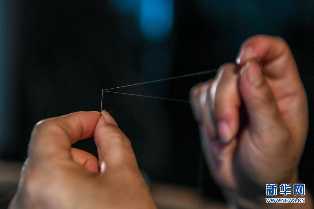 陳英華在位于蘇州高新區鎮湖街道的蘇繡工作室內穿針引線(4月14日攝)。新華社記者 李博 攝