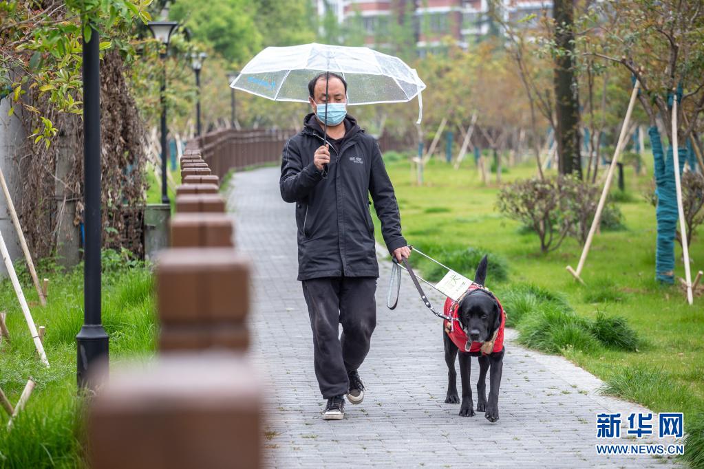 吳虎剛今年45歲,和同是盲人的妻子經營著一家盲人推拿診所。每天上班,導盲犬“C羅”都會陪伴吳虎剛從家走到診所(4月11日攝)。 新華社發(fā) (張夢 攝)