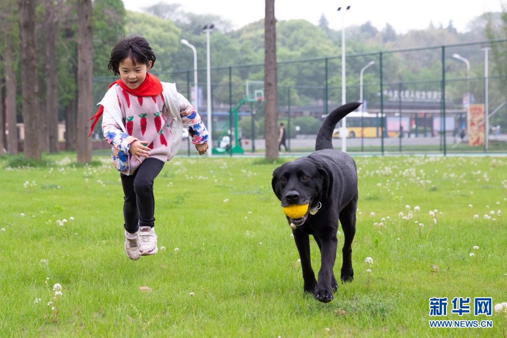 導(dǎo)盲犬“C羅”和吳虎剛的女兒在草地上玩耍(4月26日攝)。 新華社發(fā) (張夢 攝)