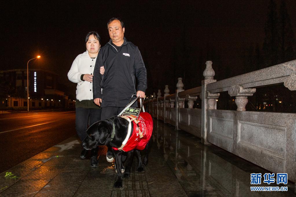 4月11日晚,妻子挽著吳虎剛,吳虎剛牽著“C羅”,共同走在下班回家的路上。 新華社發(fā) (張夢 攝)