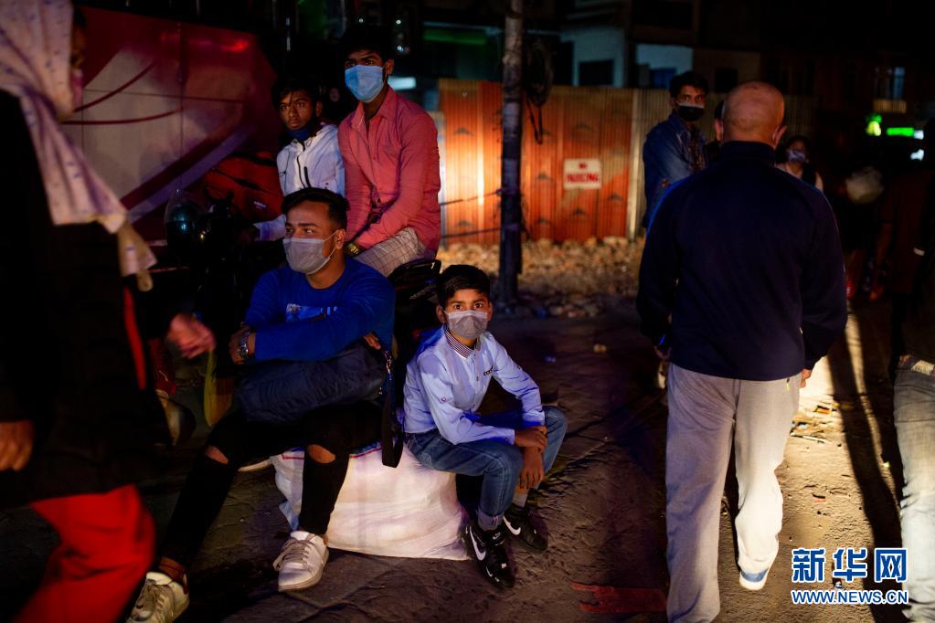 4月28日晚,人們在尼泊爾首都加德滿都的路邊等車,準(zhǔn)備在封禁措施實施前離開加德滿都返回家鄉(xiāng)。