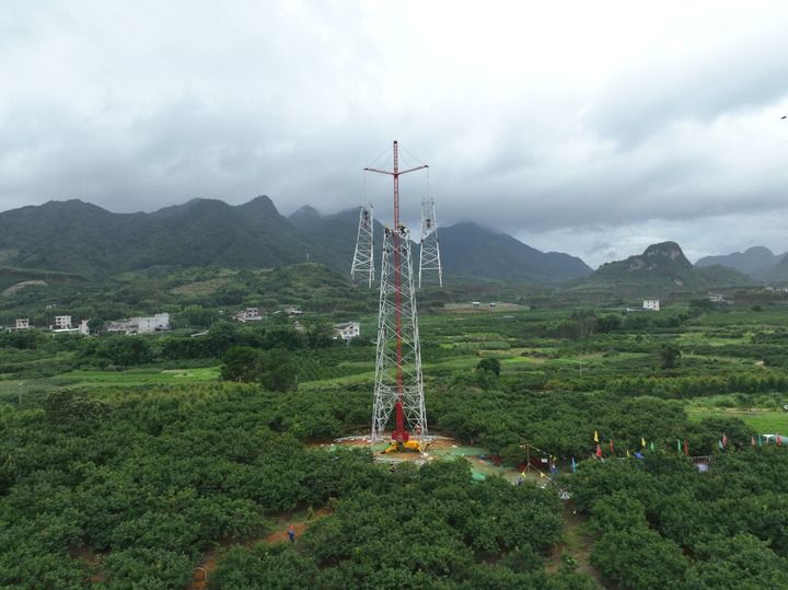 6月16日至19日,500千伏漓江站220千伏配套送出工程,施工人员使用新型履带式组塔装置在40余米的空中上演“搭积木”。(陈思萌 摄)
