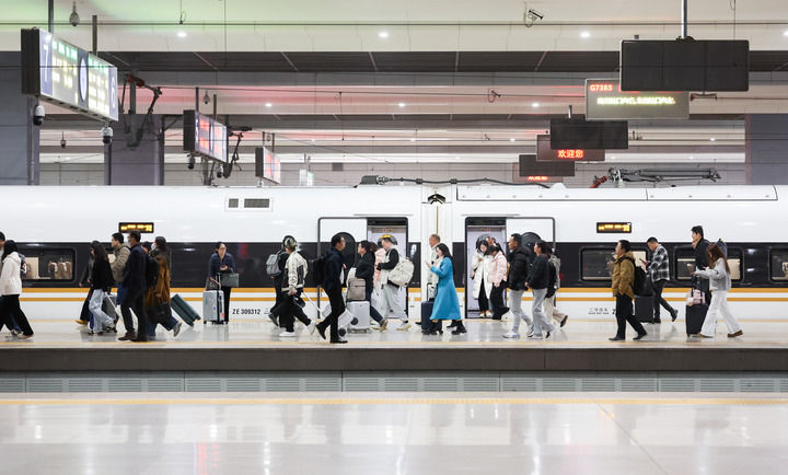 11月28日,旅客在上海虹桥火车站站台上行走。新华每日电讯记者 丁汀 摄
