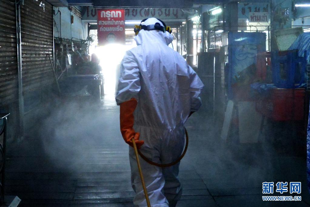 6月21日,工作人員在泰國首都曼谷一處生鮮市場進行消毒。