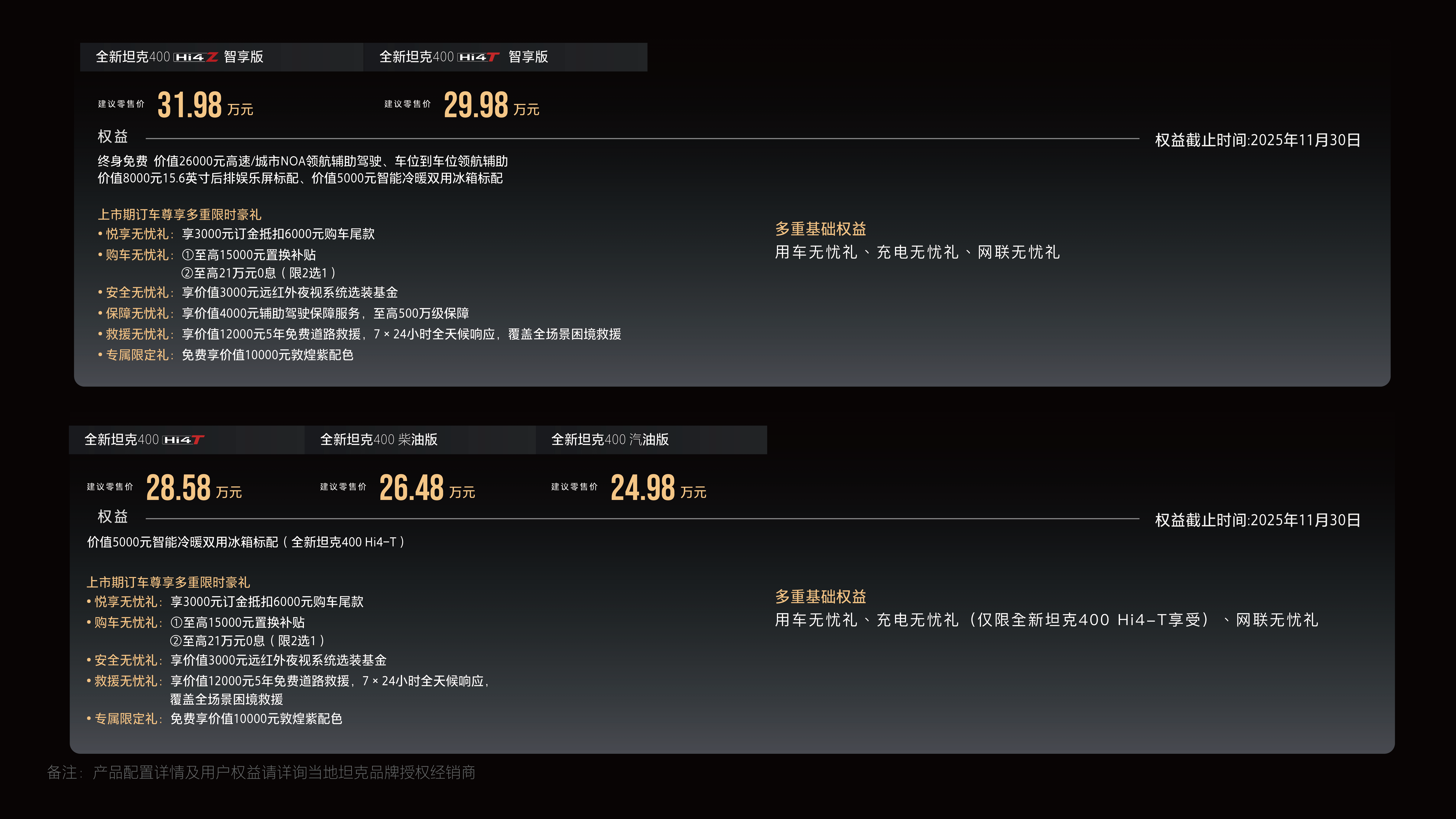 全新坦克400 Hi4-Z智享版,售价31.98万元;全新坦克400 Hi4-T智享版,售价29.98万元;全新坦克400 Hi4-T,售价28.58万元;全新坦克400 柴油版,售价26.48万元;全新坦克400 汽油版,售价24.98万元。即刻下单可享多重尊崇权益,坦克以满满诚意为用户带来惊喜购车优惠。