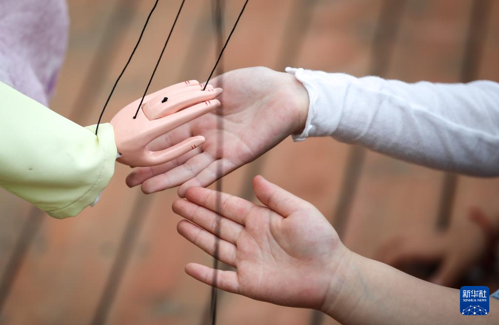 在七都幼儿园,小朋友与提线木偶互动(4月20日摄)。