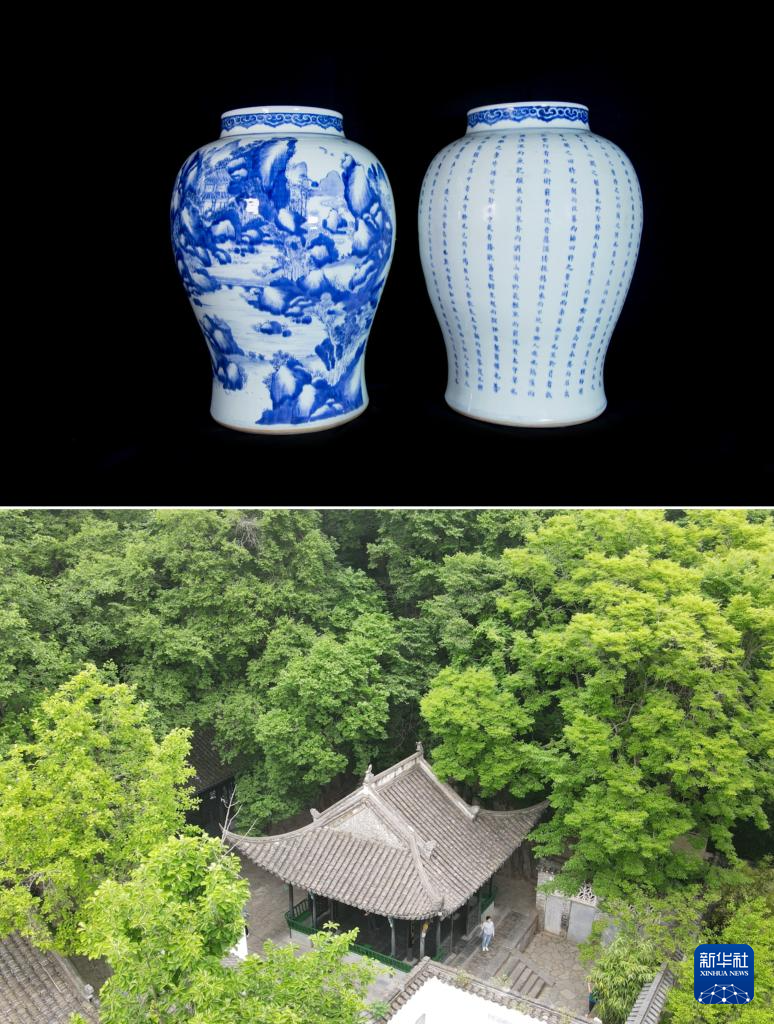 这是一张拼版照片,上图为:《清康熙青花山水诗文大将军罐》,文物上绘有醉翁亭主题的图案,现收藏于滁州市博物馆(滁州市博物馆供图);下图为:5月17日拍摄的位于安徽省滁州市琅琊山景区内的醉翁亭(无人机照片,新华社记者张端摄)。