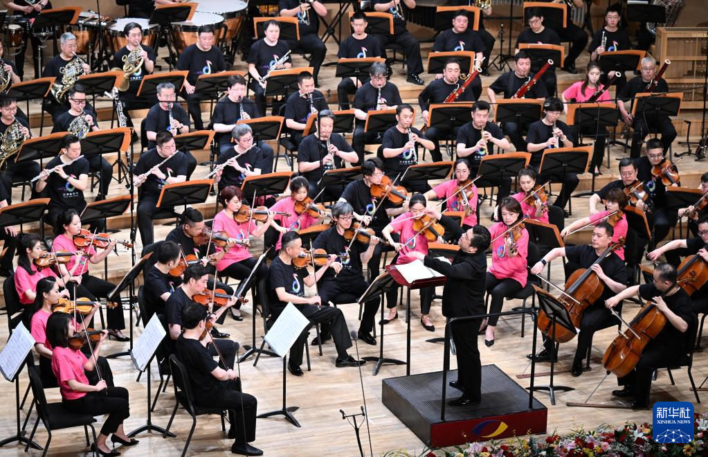 5月25日,在天津大剧院音乐厅,由天津歌舞剧院、天津交响乐团等组成的天津百人联合乐团在舞台上演奏。