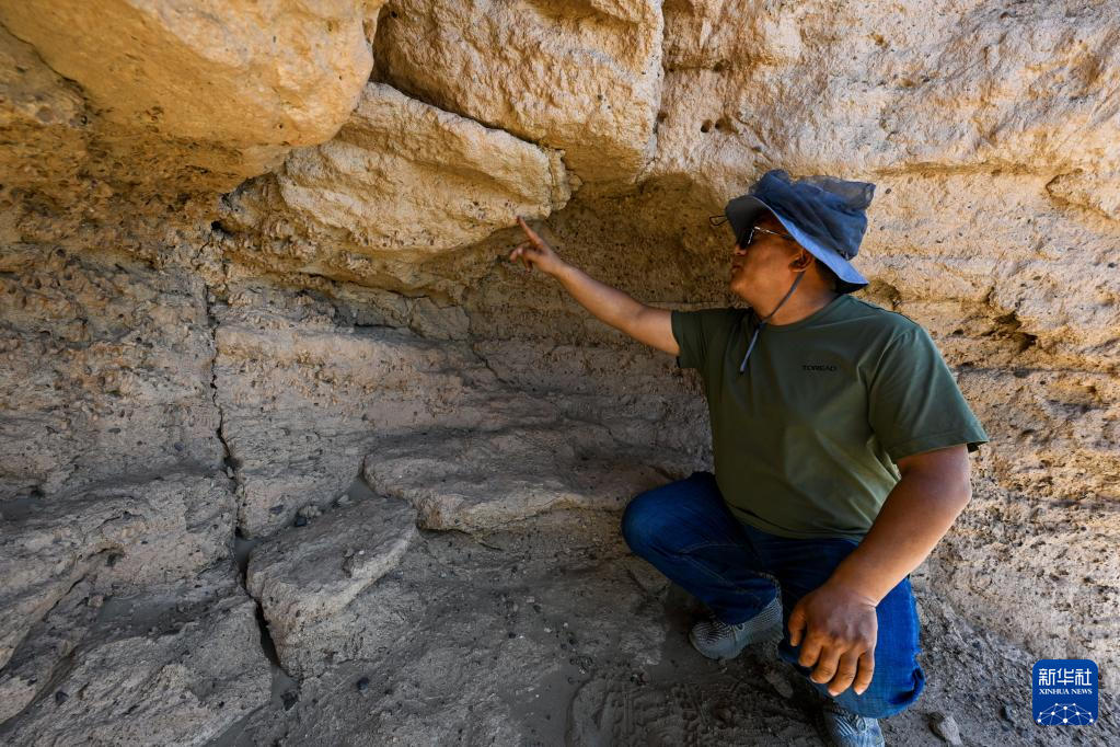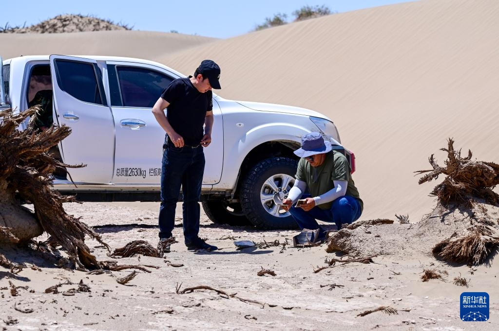 6月2日,额济纳旗文物保护中心工作人员在居延遗址附近查看散落的陶片。