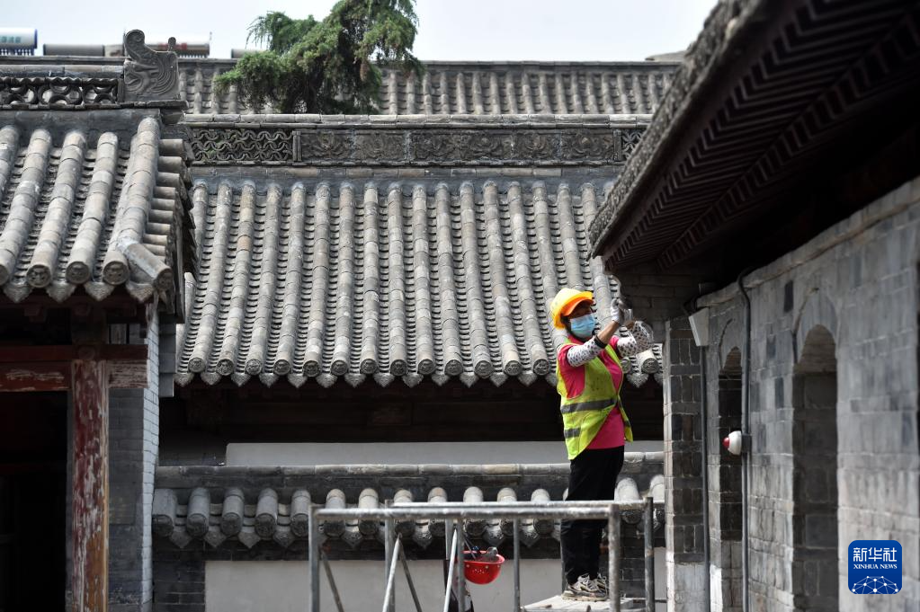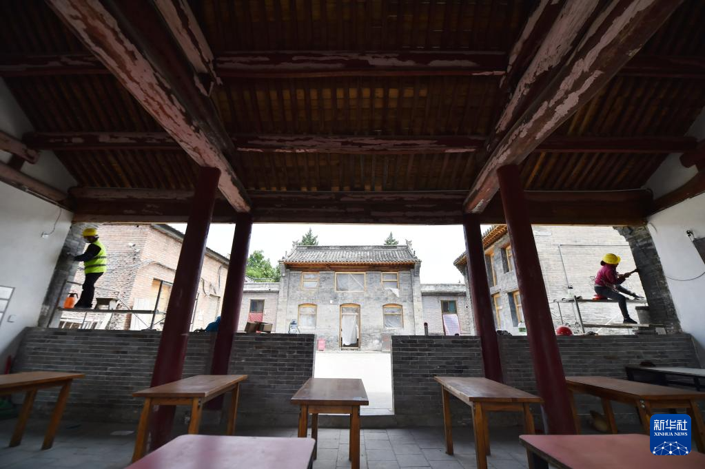 6月7日,施工人员在河北省石家庄市井陉县天长宋古城内的皆山书院进行古建筑修缮。