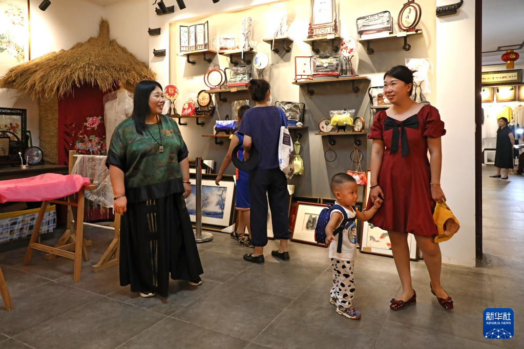 7月5日,王立君(左)在位于辽宁省营口市辽河老街上的工作室里为前来参观的游客介绍满绣创作。