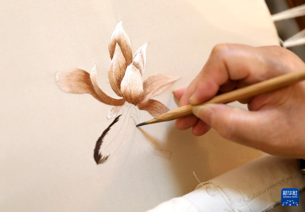7月5日,王立君在位于辽宁省营口市辽河老街上的工作室里进行满绣画稿创作。
