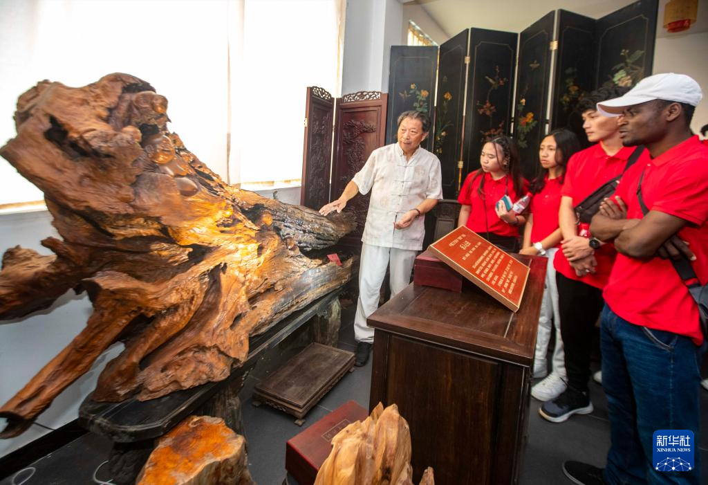 7月13日,泰州木雕省级代表性非遗传承人帅春燕(左二)为留学生们讲解木雕的雕刻工艺。