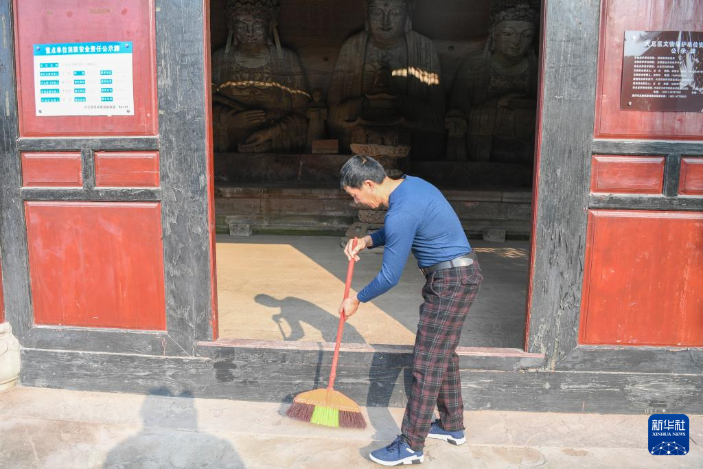 10月31日,在重庆市大足区宝顶镇香山社区,义务文保员在佛祖岩摩崖造像文物保护点打扫卫生。