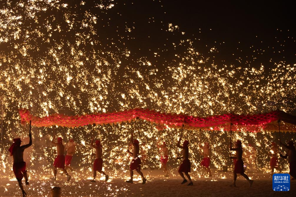 1月29日,在哈尔滨伏尔加庄园,铜梁火龙队的队员表演铜梁龙舞。