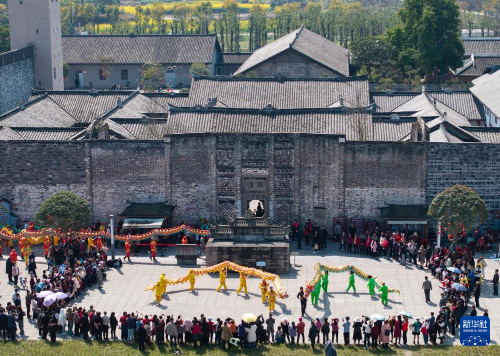 3月11日,在泸县屈氏庄园前,彩龙队进行舞龙表演(无人机照片)。