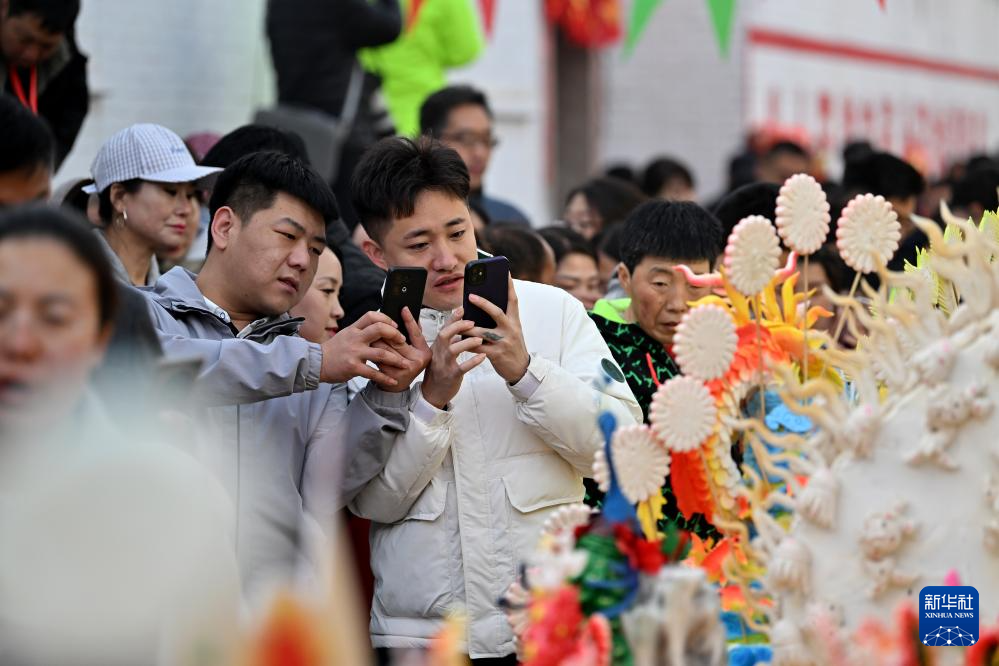 3月28日,在山西省岚县岚城镇,人们用手机拍摄面塑作品。