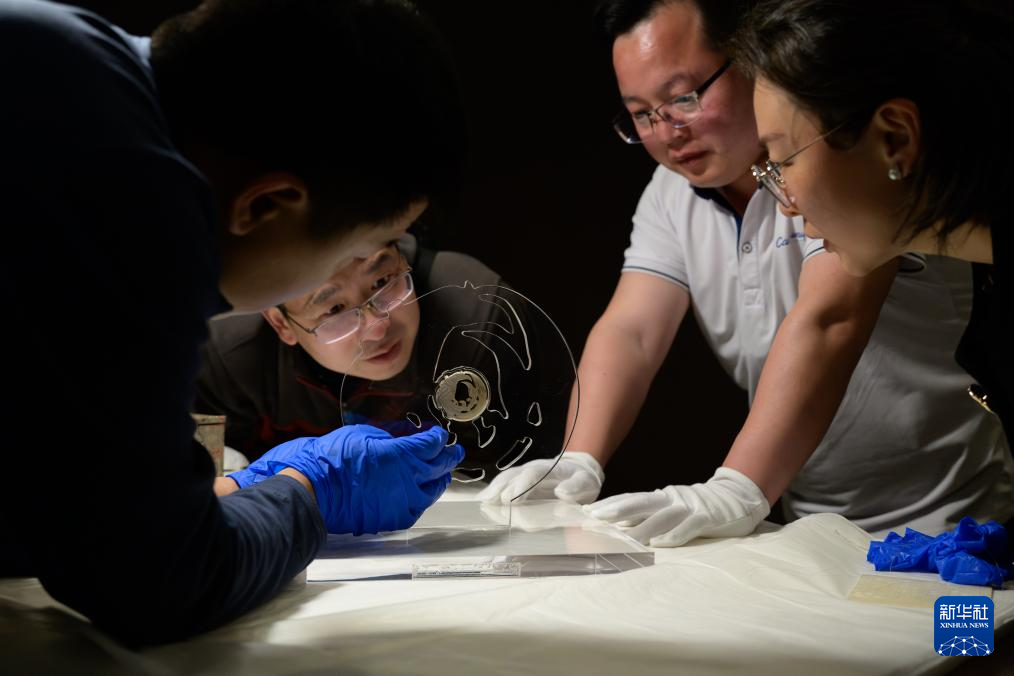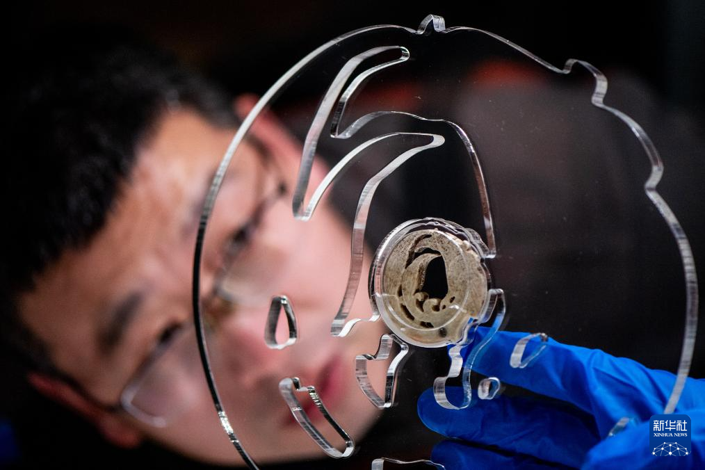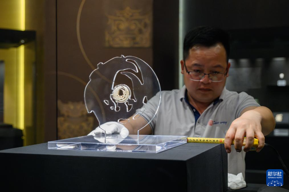 3月30日,工作人员在固定展品玉团凤。为迎接玉团凤,武汉盘龙城遗址博物院在玉团凤展柜上方将灯光布置成玉团凤形状。