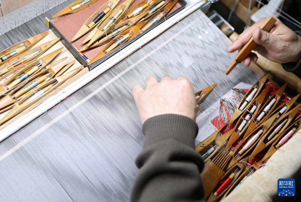 4月9日,在位于营口市的家中,申涛左手拿着缠着丝线的梭子,右手拿着梳理丝线的拨子进行缂丝作品创作。