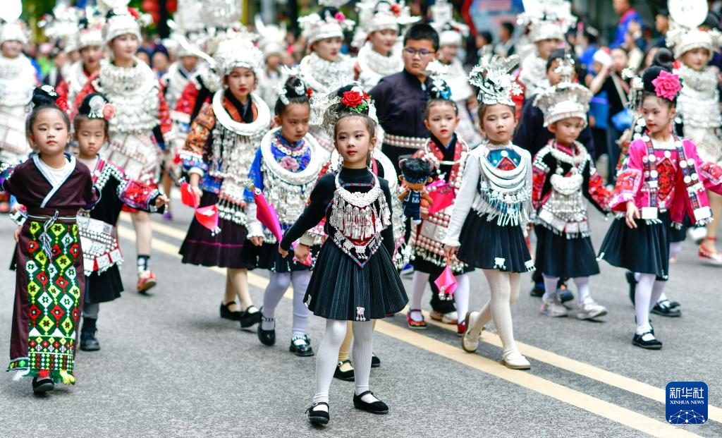 4月21日,苗族小朋友参加台江苗族姊妹节盛装游演。