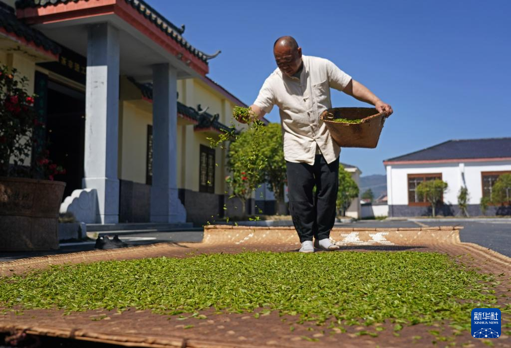 江西省修水县漫江乡的宁红茶制茶基地,俞旦华对茶叶进行传统萎凋工序(3月29日摄)。