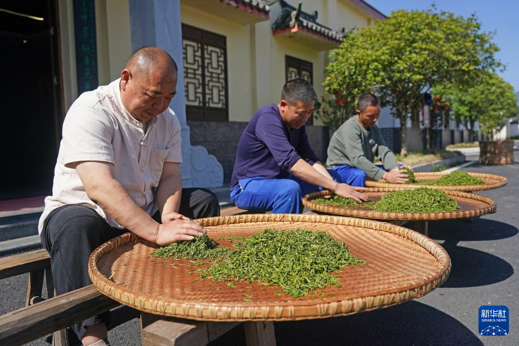 江西省修水县漫江乡的宁红茶制茶基地,制茶师傅查看茶叶的萎凋情况(3月29日摄)。