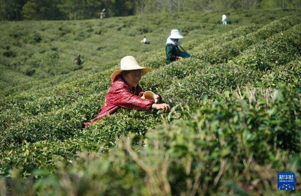 江西省修水县漫江乡的宁红茶制茶基地茶园中,茶农在采摘鲜叶(3月28日摄)。