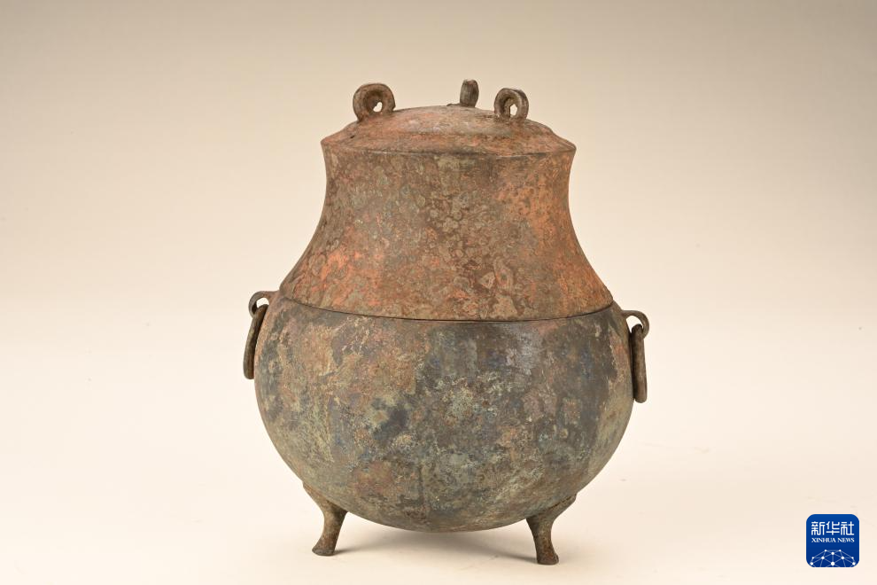 武王墩墓出土的铜鼎及其内部猪骨出土状况(5月15日摄)。新华社发