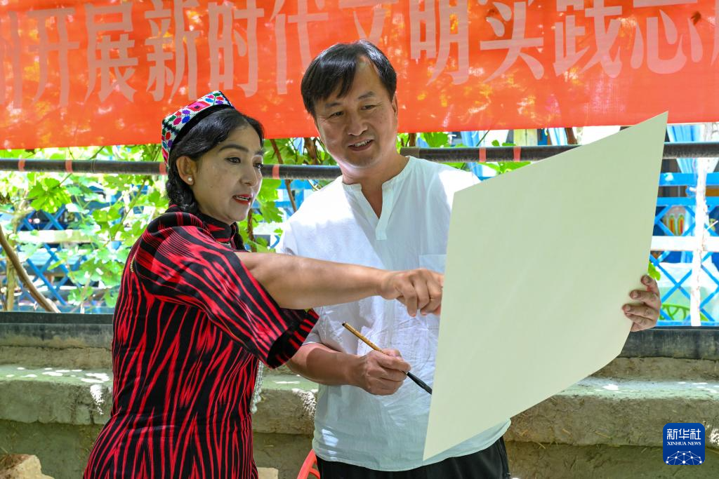 7月6日,在新疆克州阿图什市松他克镇阿孜汗村,小分队文化志愿者创作后与模特交流。