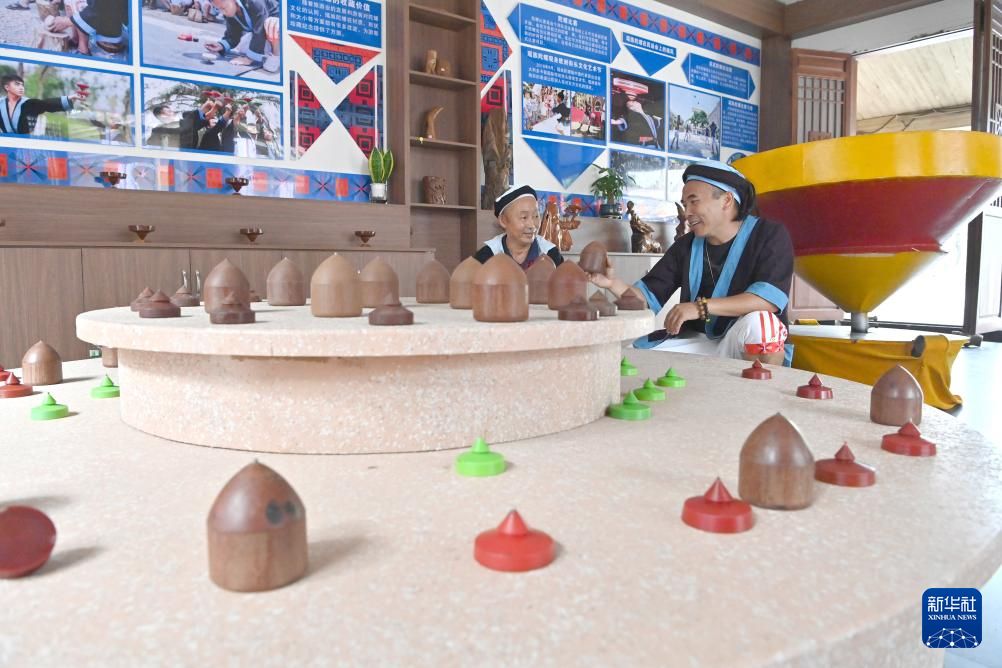 何光斌在南丹县里湖瑶族乡朵努社区展示花样陀螺(8月30日摄)。