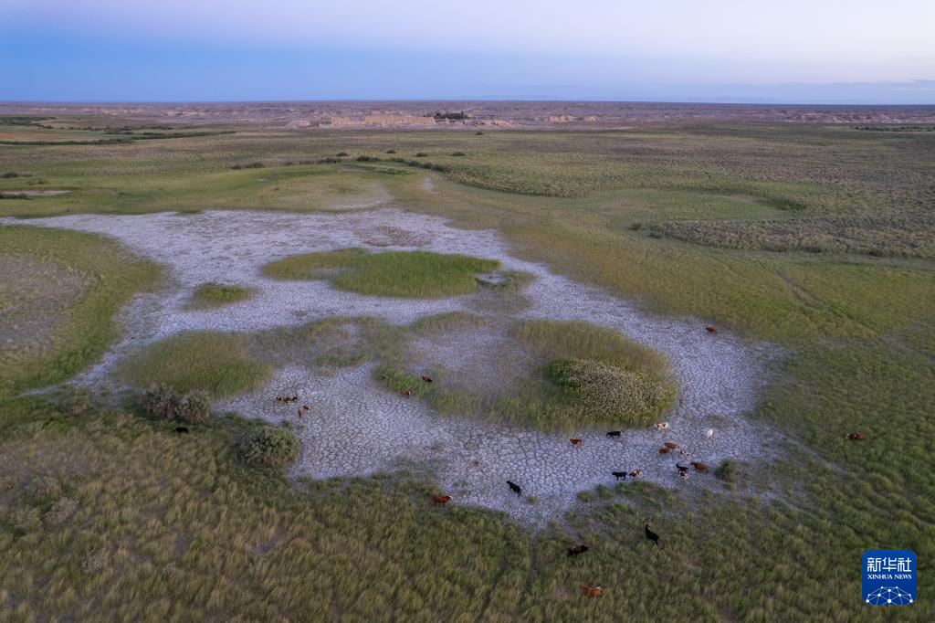 7月17日,在甘肃省敦煌市玉门关遗址区,牛群在大方盘城附近觅食(无人机照片)。