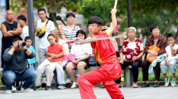9月8日,一名武术爱好者在南川楼文化街区表演弹腿。