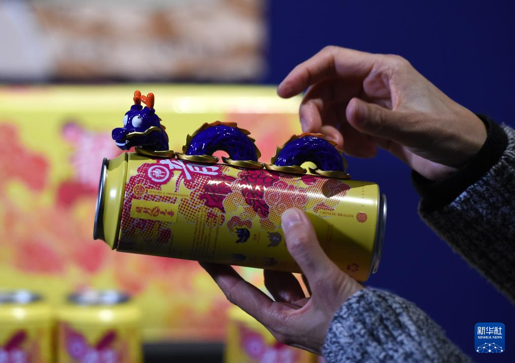 12月14日,观众在欣赏现场展示的一款龙形组合冰箱贴。