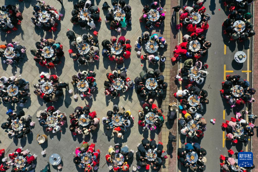 1月12日,群众在贵州省黔南布依族苗族自治州都匀市小围寨街道思源社区一起吃团圆宴(无人机照片)。