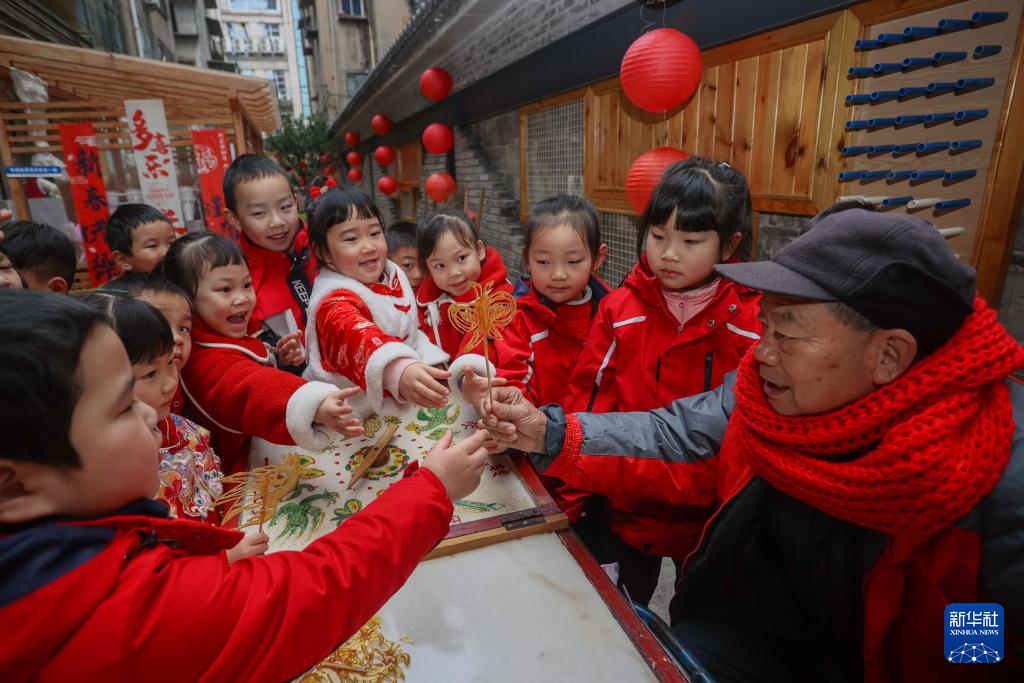 1月13日,在四川省遂宁市船山区顺城街幼儿园举办的新春庙会上,孩子们围观糖画制作。