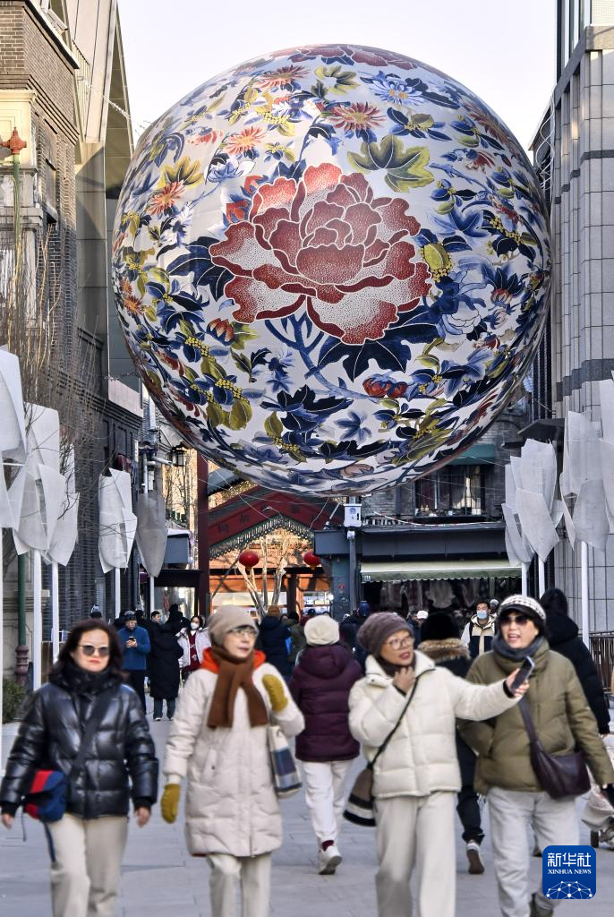 前门商业区的北京坊安装了巨型的牡丹花灯,吸引了大批游客前来观赏(1月13日摄)。