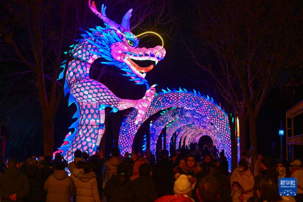 1月18日晚,河南洛阳2025年隋唐河洛文化庙会暨新春灯会试亮灯,吸引市民游客观赏。