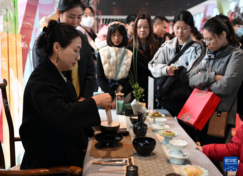3月29日,在嘉亭荟举行的文旅市集上,市民们欣赏传统茶艺表演。