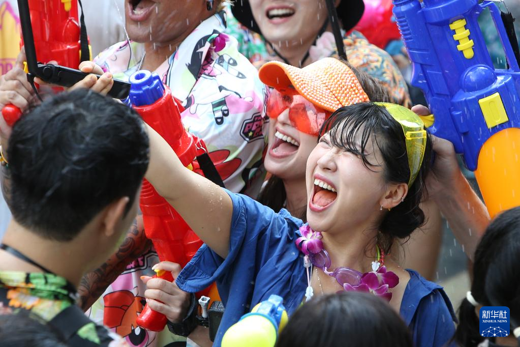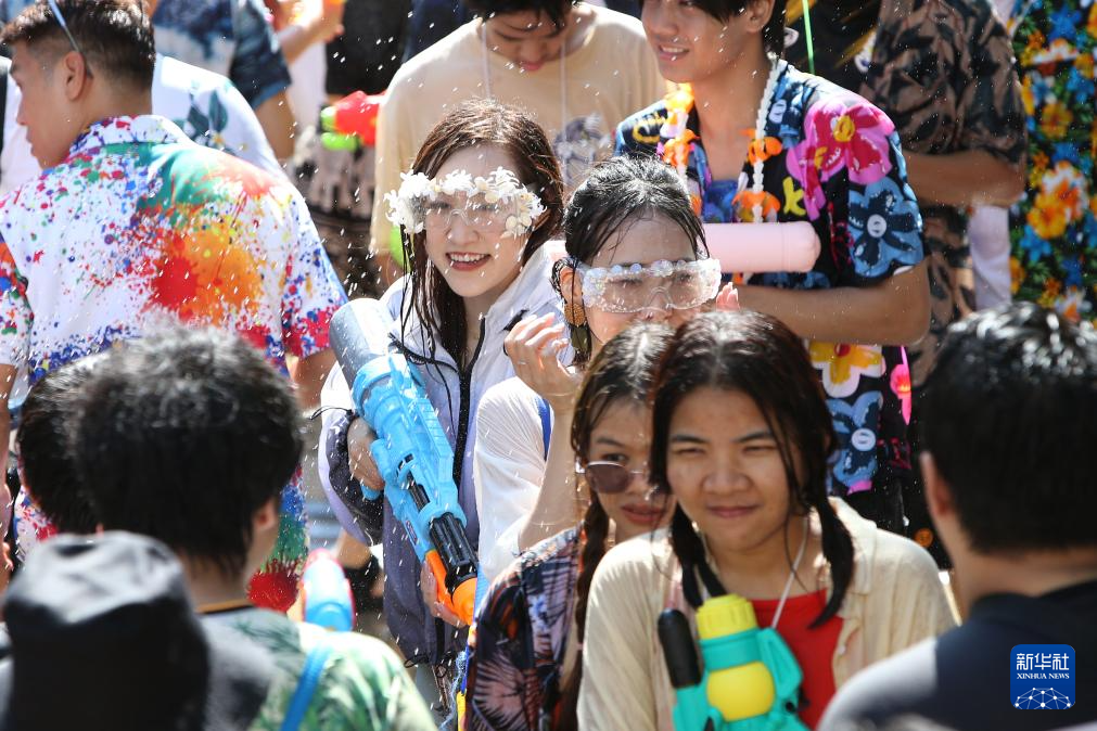 4月13日,人们在泰国曼谷街头参加泼水节庆祝活动。