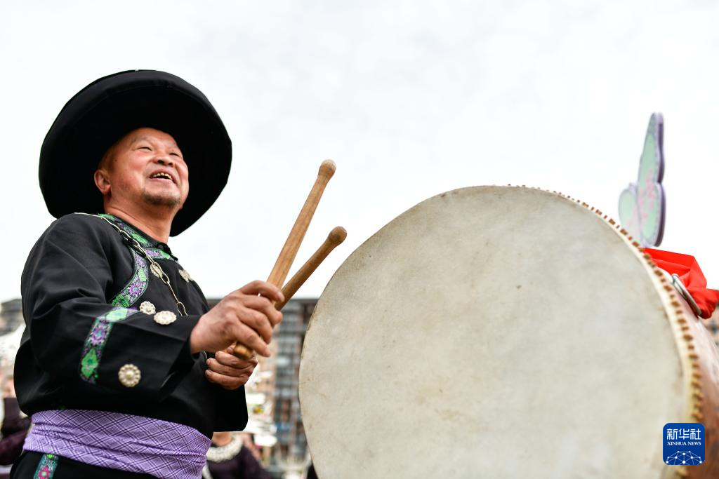 4月12日,少数民族群众在贵州台江苗族姊妹节活动中击鼓。