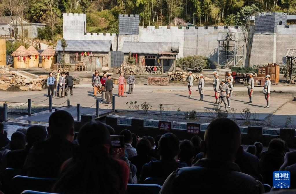 2025年3月19日,游客在安徽省霍山县落儿岭镇观看大型实景剧《大别山传奇》。新华社记者 朱青 摄
