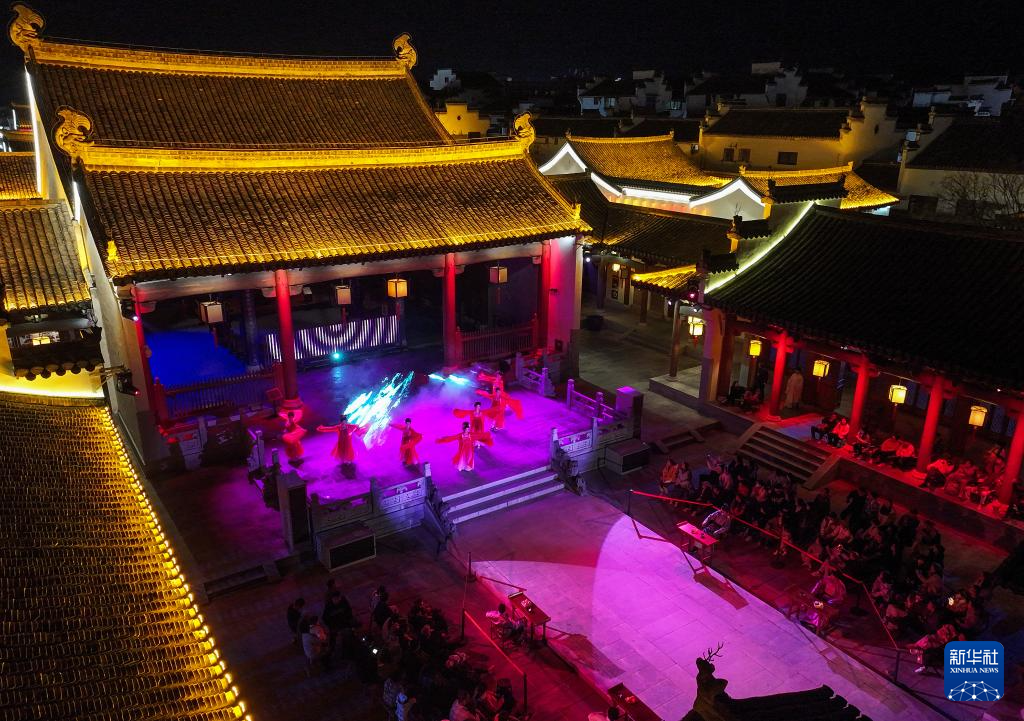 2025年3月22日,游客在安徽省黄山市歙县徽州古城观看《徽州府有喜》沉浸式实景演出(无人机照片)。新华社发(施亚磊 摄)