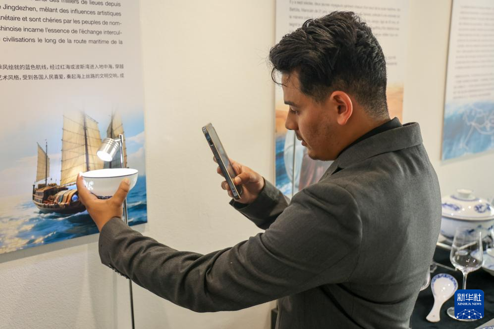 5月9日,在摩洛哥首都拉巴特举行的“茶和天下·雅集”暨“江西风景独好”摩洛哥“江西日”活动的江西非遗技艺展演现场,一名摩洛哥观众拍摄一件景德镇青花玲珑瓷碗。