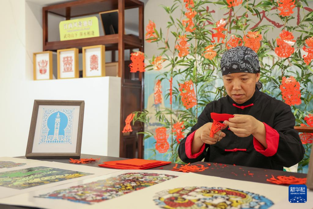 5月9日,在摩洛哥首都拉巴特举行的“茶和天下·雅集”暨“江西风景独好”摩洛哥“江西日”活动的江西非遗技艺展演现场,手工艺者展示剪纸技艺。