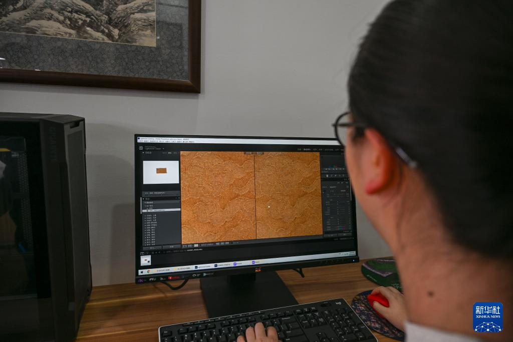 工作人员对文物补料样品照片进行校色(5月18日摄)。