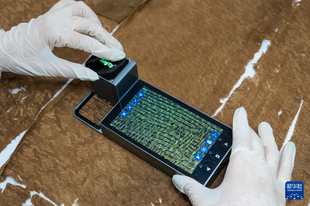 陈琰璐使用便携式显微镜对织物进行检测分析(5月18日摄)。