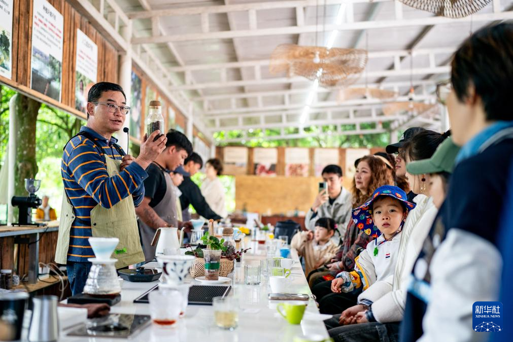 咖啡师在云南省普洱市宁洱哈尼族彝族自治县一家咖啡庄园冲泡咖啡(2025年5月15日摄)。