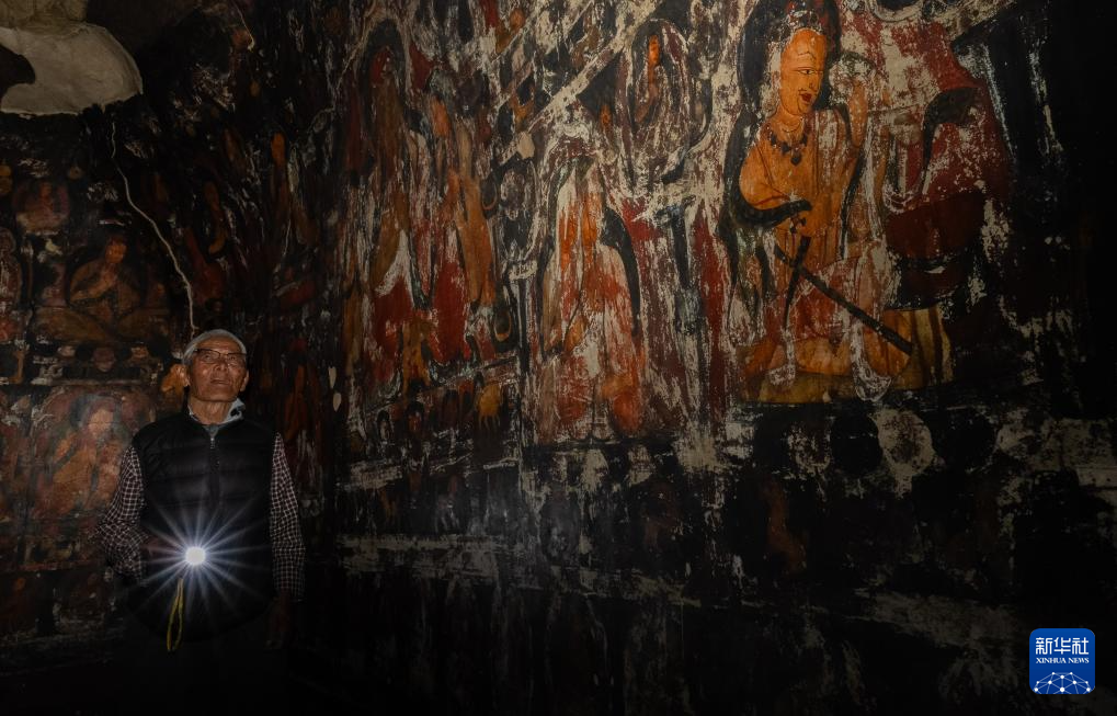 仁增旺扎在石窟内检查是否有渗水、坍塌等风险(6月24日摄)。