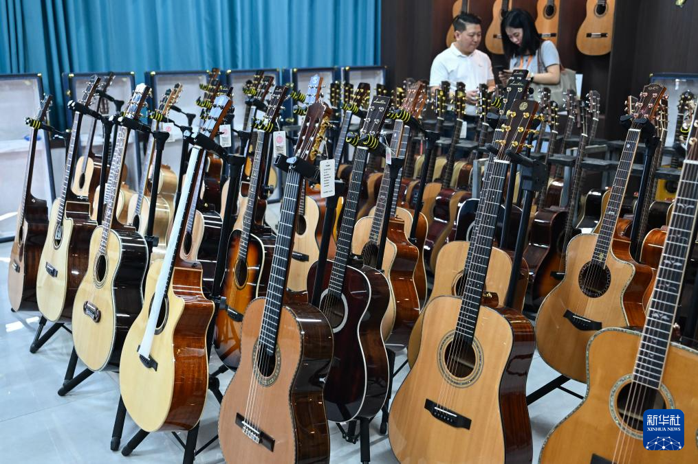 8月28日,参观者在湖北省松滋市一家吉他企业展厅参观吉他成品。