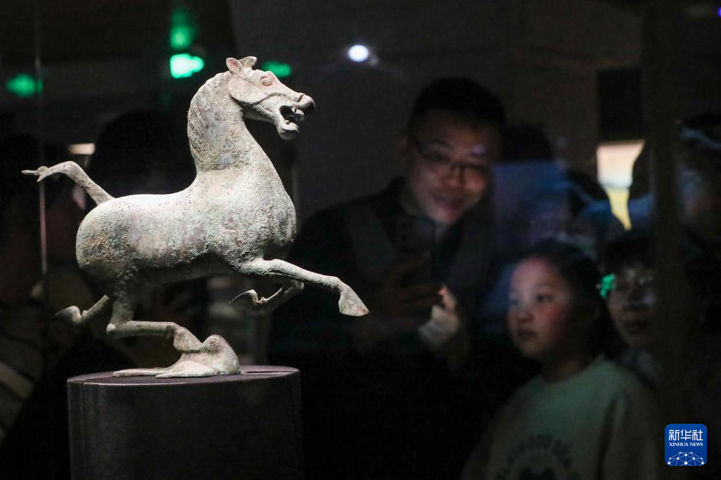 1月26日晚,在甘肃省博物馆二楼丝绸之路文明展厅,观众观看铜奔马(复制品)。
